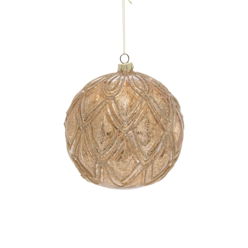 Sparkling scalloped lines trim the warm brown base of the Adriatic Ornament, a beautiful glass sphere with dimensional details and a brilliant glow. Trimmed in thin lines of glitter and capped with a small gold top and string, both lightweight sizes of the Adriatic bring stunning style to the Christmas tree.