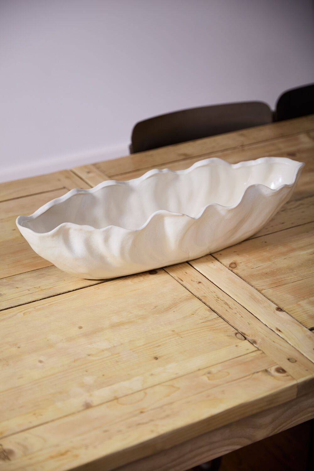 Celebrate artisanal style with the elongated wide ceramic Coastline Trough. Featuring an organic ruffled rim & a warm white reactive glaze that provides variation in the finish, this piece makes a lovely long centerpiece for floral arrangments, orchids, other blooming plants. The dimensions allow for any type of floral mechanics. This home decorative accent piece is a lovely display for a console, coffee table, or dining table.