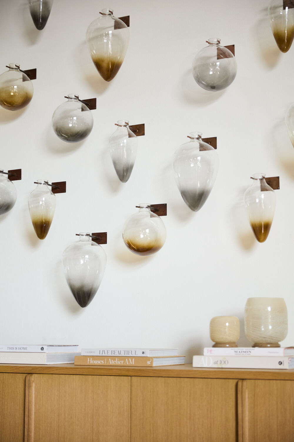 The walls have never looked more chic & complete than with the Envision Wall Mount Vase Collection. These handmade borosilicate glass vases feature a bottle neck opening & come with a metal wall attachment. Arrange all 6 Envision Vase shapes & colors together for an elegant, impactful grouping.