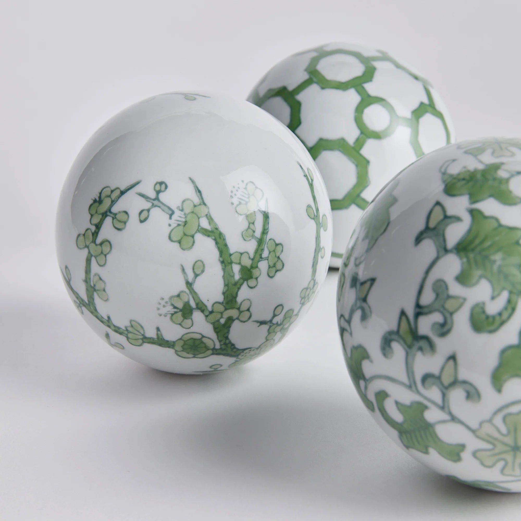 A classic chinoiserie in shades of green. How refreshing! The color green is known to have a harmonizing, balancing effect, so is an inspired design choice for the Imperial Orbs in coordinating patterns. A welcome addition, bringing stability and calm to the well-appointed bookshelf, mantel or entry console.
